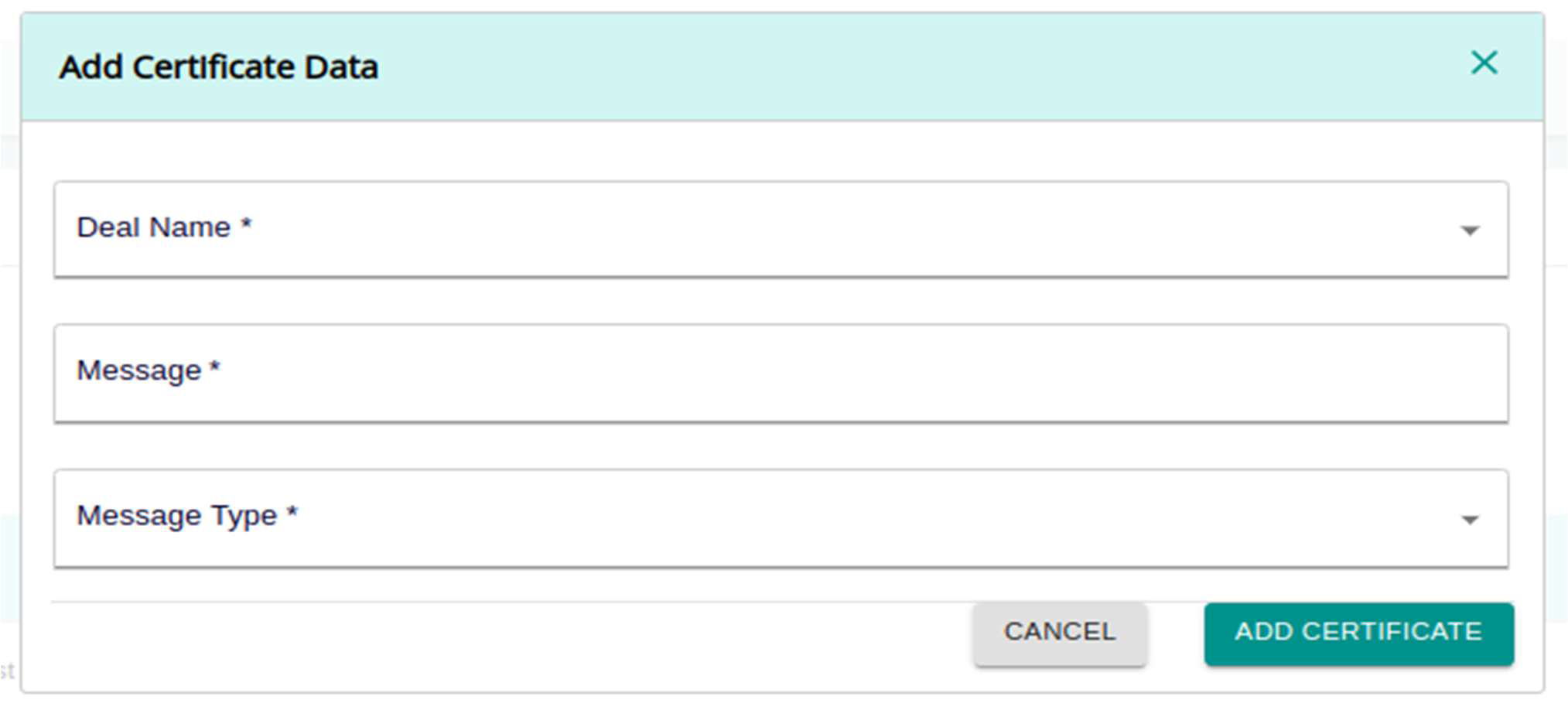 Figure: 17- Onboard Certificate data The OnBoard Certificate screen is accessible to admins and allows them to manage certificate-related messages for a specific Deal. Key Features: ● Admins can view all onboarded messages associated with a ...