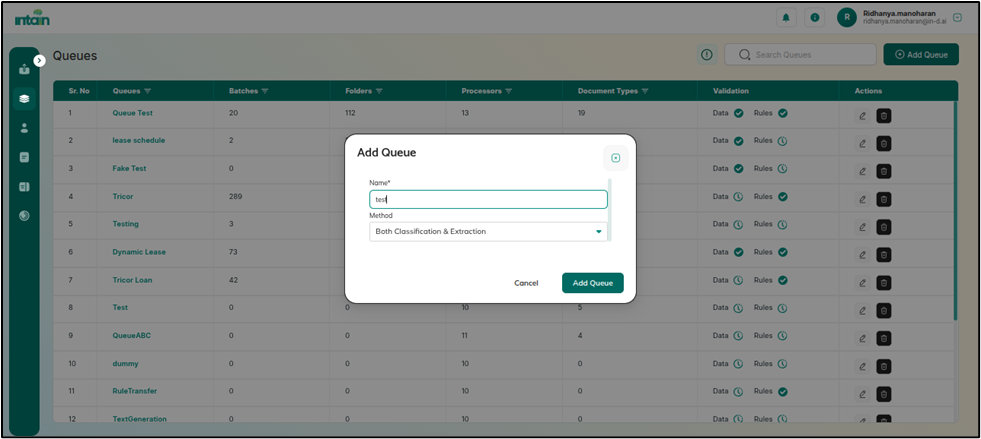 A queue is a processing pipeline configured for a specific type of work. For example, you might have: ● A "Lease Portfolio" queue for equipment leases ● A "Loan Portfolio" queue for term loans ● A "Client ABC" queue for a specific client's documents ...