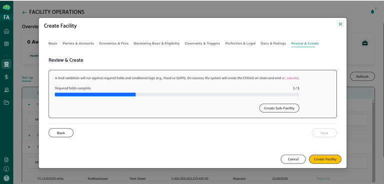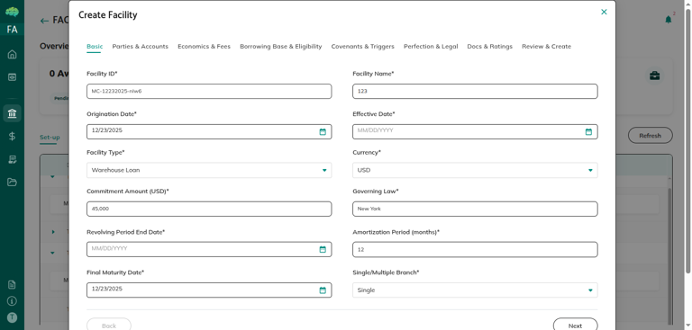 • The master commitment remains in Draft status until you click Create Facility