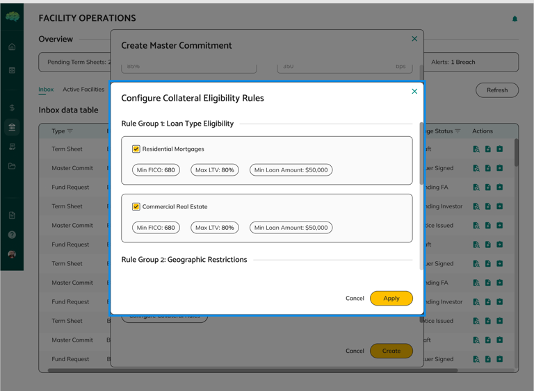• Only Draft Can Be Edited: You can only configure master commitments in Draft status. Once submitted for lender approval, you cannot edit.