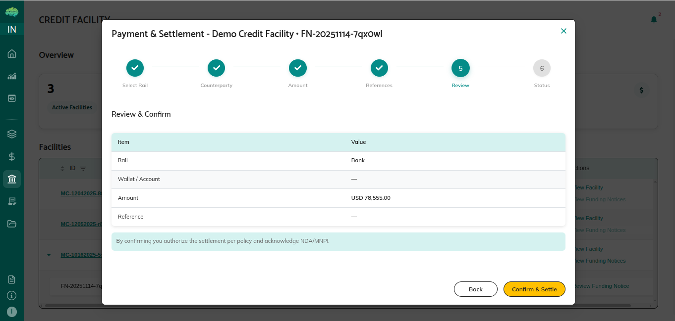 Lenders go to their Credit Facility section and see Review Funding Notice . Theyreview the notice, select a payment method, transfer funds, and click Confirm and Settle.
