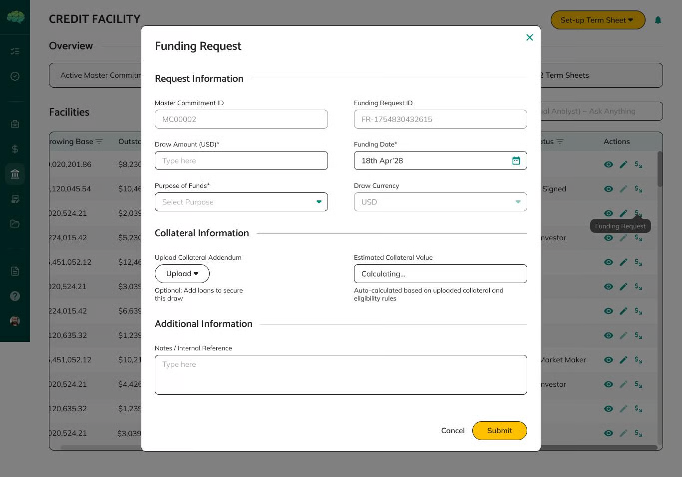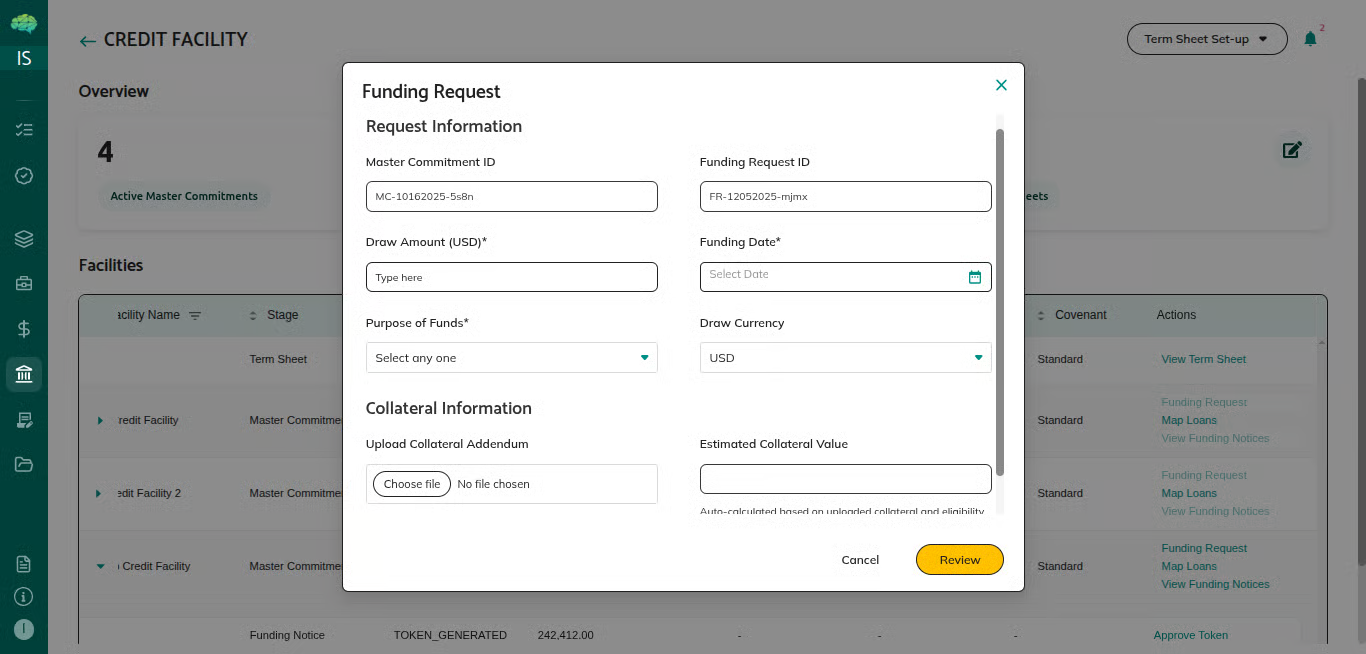 Click Review to create the funding request (status: DRAFT). Click Submit to send tothe facility agent for review (status: