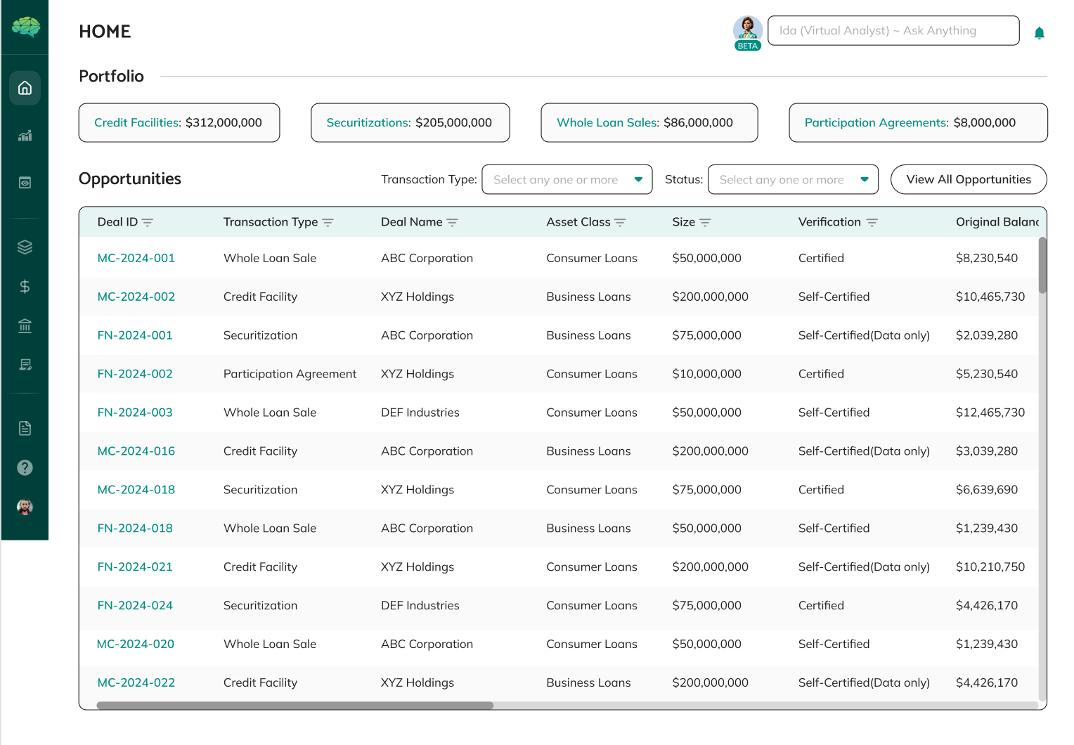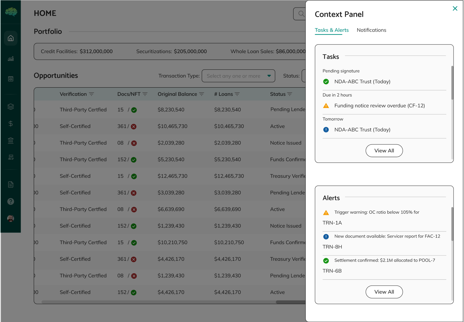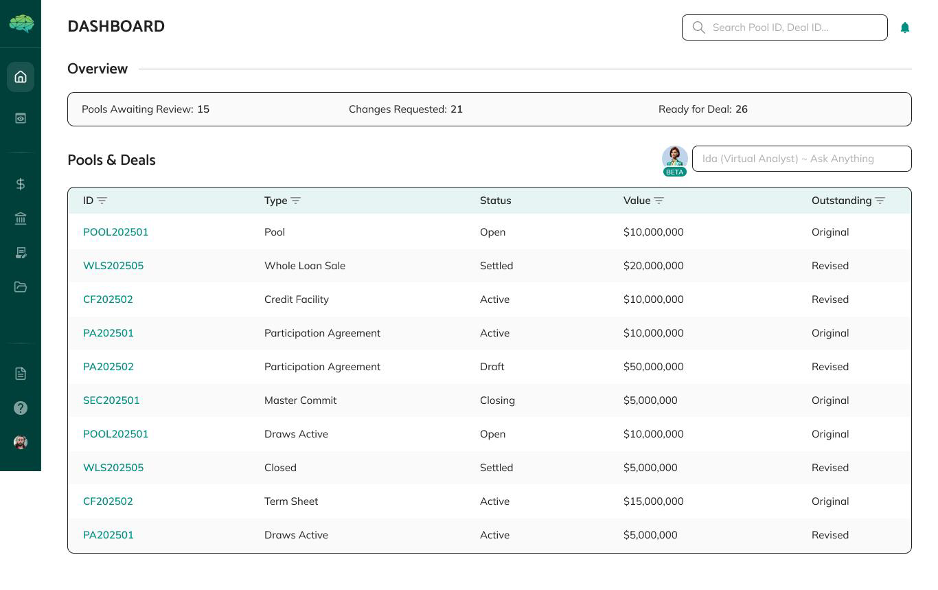 Main Navigation - A left-side expandable navigation section contains tabs forPools, Loan Registry, Credit Facility, Whole Loan, Securitization, and other sections.These navigation tabs are available throughout the platform and help you movebetween different areas.