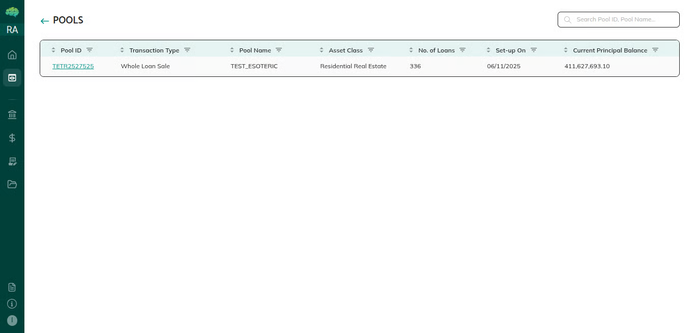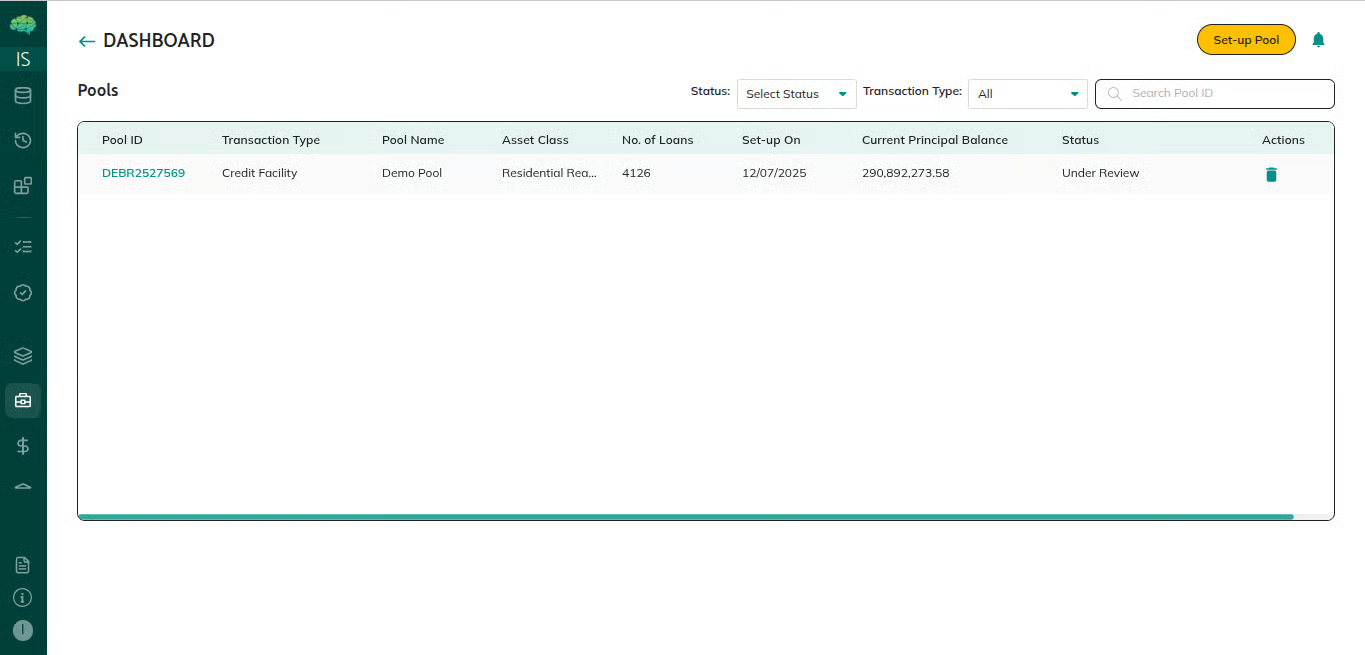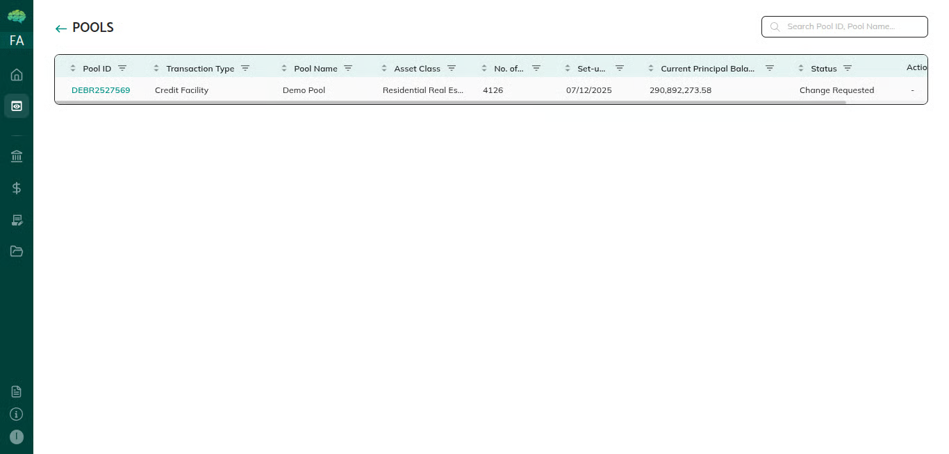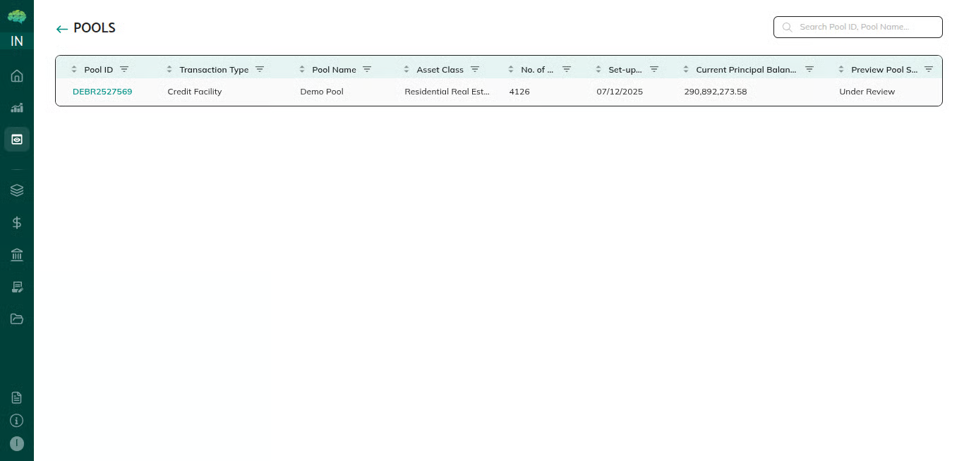 Different users see pools differently based on their role in the platform. The role youselect during login determines what pools you can see, what information isdisplayed, and what actions are available. Issuers see pools they create andmanage; market makers see pools shared with them for review and structuring;investors see pools shared with them; rating agencies see pools shared foranalysis. Each role has a tailored view that shows only relevant information and appropriate actions.