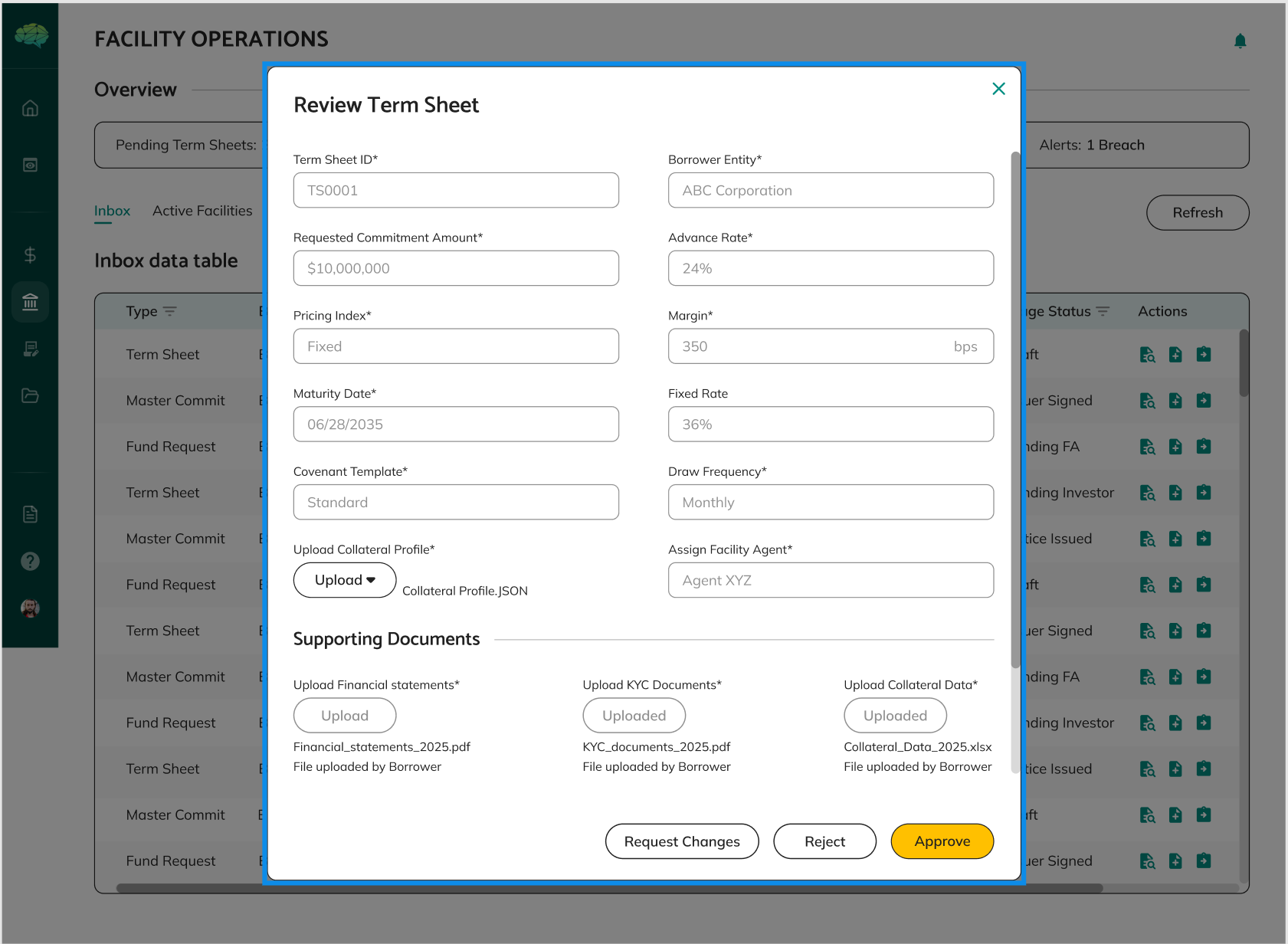 • Term sheet status shows CHANGES_REQUESTED